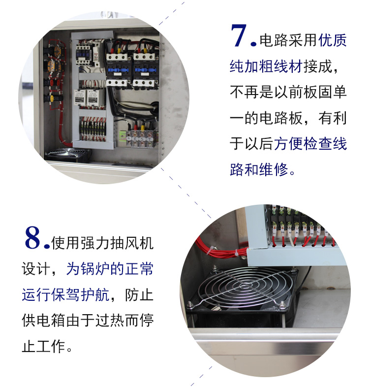2、合理性:為合理有效的使用電能,特別將加熱功率分為數(shù)段,并由控制器自動(dòng)循環(huán)投入(切斷)用戶根據(jù)實(shí)際需要確定好加熱功率后,只需合上相應(yīng)漏電斷路器(或按下相應(yīng)的投切開(kāi)關(guān))即可。加熱管的分段循環(huán)投切,降低了鍋爐在運(yùn)行中對(duì)電網(wǎng)的沖擊。