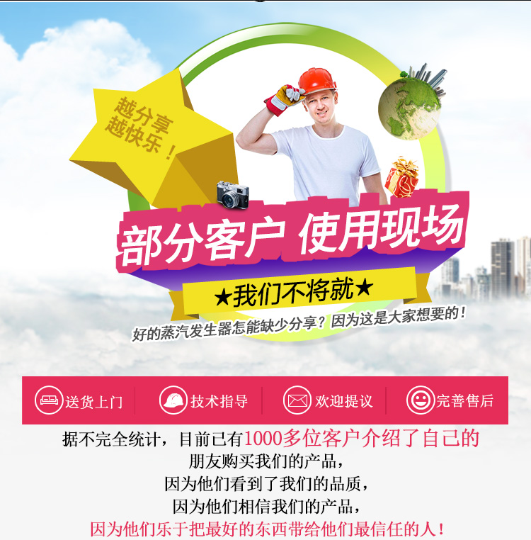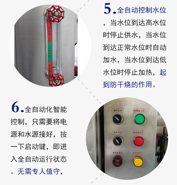 2.工業(yè)用:小型制衣廠,化工生產(chǎn)線用蒸汽;配套食品機(jī)械,醫(yī) 療機(jī)械,化工機(jī)械;制茶發(fā)酵;酒店蒸飯保溫,熨燙等等。