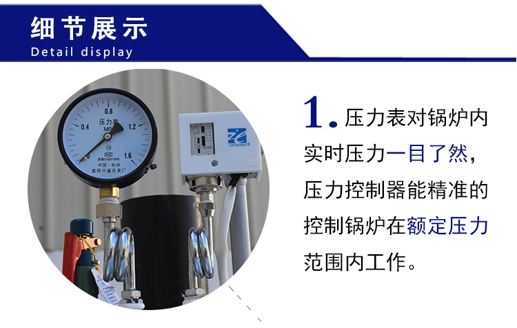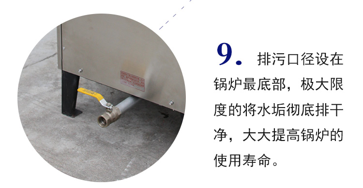 4.不銹鋼蒸汽發(fā)生器的電加熱元件的頂裝垂直布置,能使附送在電熱元件的水垢在熱脹冷縮的作用下,迅速剝離、脫落,并通過(guò)排污管排除。從而延長(zhǎng)電熱元件的使用壽命。