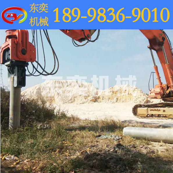 振動(dòng)打樁機(jī)是由樁錘、副臂、夾嘴等設(shè)備組成,利用其高頻振動(dòng),以高加速度振動(dòng)樁身,將機(jī)械產(chǎn)生的垂直振動(dòng)傳給樁體,導(dǎo)致樁周圍的土體結(jié)構(gòu)因振動(dòng)發(fā)生變化,強(qiáng)度降低。樁身周圍土體液化,減少樁側(cè)與土體的摩擦阻力,然后以挖機(jī)下壓力、振動(dòng)沉拔錘與樁身自重將樁沉入土中。拔樁時(shí),在一邊振動(dòng)的情況下,以挖機(jī)上提力將樁拔起。打樁機(jī)械所需要的激振力要根據(jù)場(chǎng)地土層、土質(zhì)、含水量及樁的種類、構(gòu)造而綜合確定。