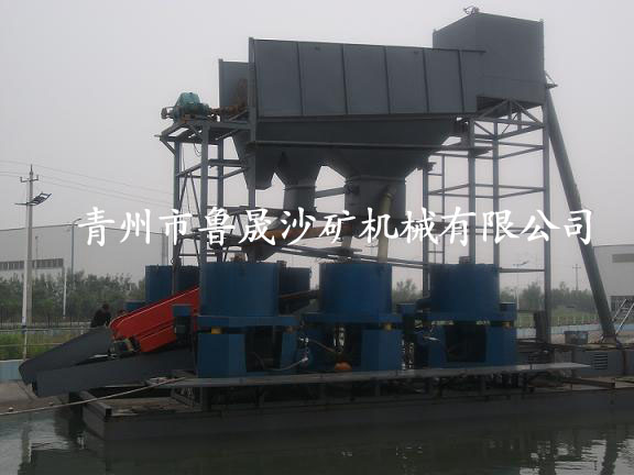 水套離心機(jī)淘金船的工作流程:船上的設(shè)備由八個系統(tǒng)組成。