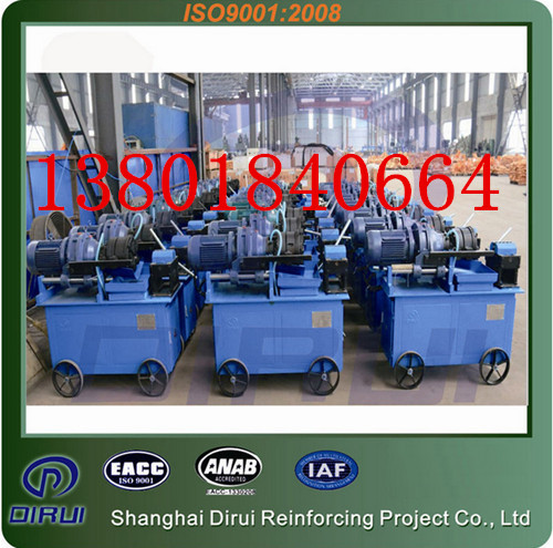 根據(jù)鋼筋直徑調(diào)整好滾絲機(jī)上的滾絲輪、剝肋刀片,然后用滾絲機(jī)上的鉗子將要滾絲的鋼筋固定好,轉(zhuǎn)動滾絲機(jī)機(jī)頭前進(jìn)的控制輪,機(jī)頭將鋼筋剝肋、三個滾絲輪對鋼筋進(jìn)行轉(zhuǎn)動擠壓,形成絲扣,然后反向轉(zhuǎn)動滾絲機(jī)機(jī)頭前進(jìn)的控制輪,退出機(jī)頭。由于絲扣是擠壓出來的而不是車床車出來的,所以絲扣部分的強(qiáng)度要高于鋼筋母材。