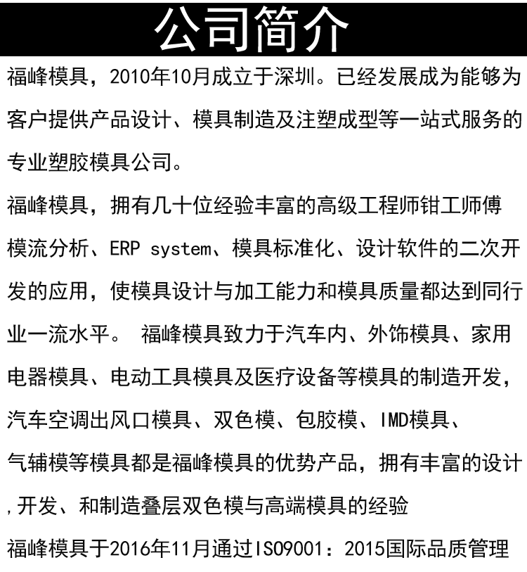 深圳市寶安區(qū)松崗福峰模具廠座落于深 圳市 寶安區(qū)松崗鎮(zhèn)譚頭第二工業(yè)區(qū)廠房8棟,是一 家專注塑膠模具行業(yè)15年的模具制造出,公 司 具備汽車模具,醫(yī)療設(shè)備模具,家電模 具,電 動工具模具,雙色模具,包膠模具, 多種模具 設(shè)計與產(chǎn)品制造,機(jī)加工、CNC加 工、拋光、 電鍍等工藝一條龍的一站式生產(chǎn)廠家,公司不僅傭有精密的模具制造設(shè)備和壓鑄設(shè)備,還配備了各種...