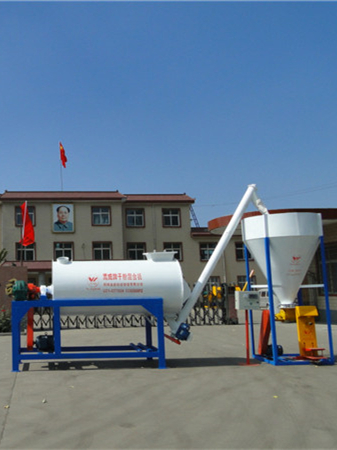 嵩威牌swjx-2混合機組由上料絞龍、混合機、提升絞龍、臥式儲料倉、稱重裝袋機、空氣壓縮機、控制柜等組成。上料絞龍用于給混合機上料,提升絞龍可將混合后的成品料提升到儲料倉。臥式儲料倉底部有攪拌螺帶軸,用于防止物料結拱,同時可將物料輸送到裝袋機。儲料倉下方可裝兩臺稱重裝袋機,用于成品包裝。