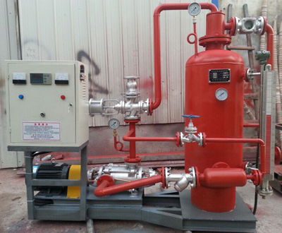 蒸汽回收裝置通常情況下,其工作壓力設(shè)置在0.1mpa以下,在實(shí)際選用時(shí)將更具回水背壓的高低選擇想對(duì)應(yīng)的箱內(nèi)工作壓力,使箱內(nèi)永遠(yuǎn)保持密封,不通大氣。在蓄水箱內(nèi)的汽、液兩相流體,在壓力平衡裝置調(diào)節(jié)下,使液面上形成一定的壓力,在通過汽蝕消除器,使冷凝水泵在吸入高溫冷凝水的過程中,改變了水泵汽蝕發(fā)生的條件,保證了整個(gè)回水在密閉運(yùn)行條件下,蒸汽回收機(jī)冷凝水泵不發(fā)生汽蝕。根據(jù)各系統(tǒng)工況的實(shí)際需求,我們按本設(shè)備的水泵運(yùn)作方式分為兩種:一種為連續(xù)運(yùn)動(dòng),主要正隊(duì)供水連續(xù)性的要求相當(dāng)嚴(yán)格的情況,而采取的運(yùn)行方式;另一種為間歇式運(yùn)行,水泵按水箱內(nèi)冷凝水的充滿度來設(shè)置的運(yùn)行方式。蒸汽回收機(jī)在同一電器控制柜內(nèi)分別有手動(dòng)與自動(dòng)兩重控