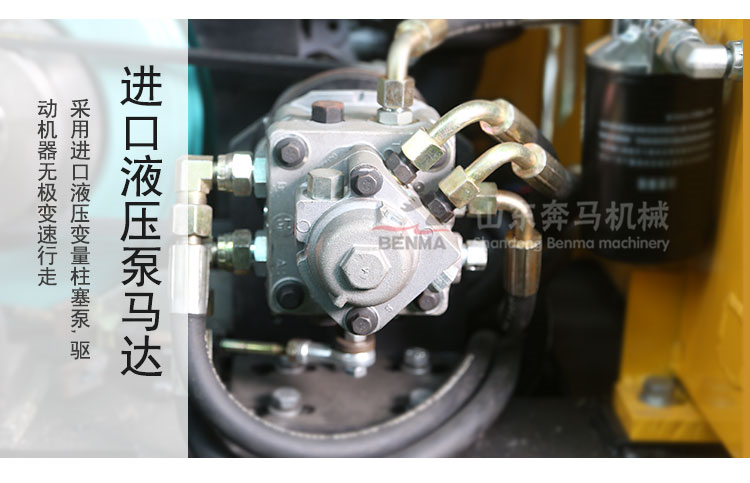 2.采用國(guó)際品牌液壓泵和定量馬達(dá),無(wú)極變速,前后行走,變向方便