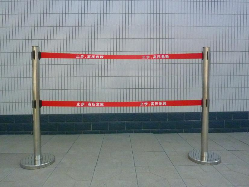圍欄帶材質(zhì)為錦綸高強絲帶拉力大于5kn,帶子長度3米,寬度50mm,厚度0.5mm,帶面為紅色雙帶,警示標語為“止步,高壓危險”立桿為不銹鋼材質(zhì),外徑76mm,圍欄總高度1000mm,底座材質(zhì)為鑄鐵,上面有不銹鋼外罩,直徑350mm,高50mm。