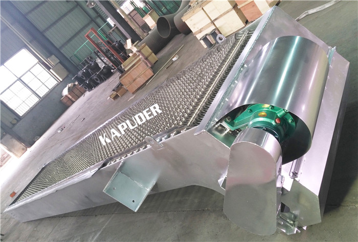 耙齒鏈運轉到設備的上部時,由于槽輪和彎軌的導向,使每組耙齒之間相對自清運動,絕大部分固體物質靠重力落下。另一部分則靠毛刷清掃器的反向運動把粘在耙齒上的雜物清掃干凈。按水流方向耙齒鏈類同于格柵,在耙齒鏈軸上裝配的耙齒間隙,可根據(jù)用戶的使用條件需要,進行選擇。由耙齒把流體中的固態(tài)懸浮物分離后,才能保證水流暢通流過。整個工作過程是連續(xù)的,也可以是間歇的。