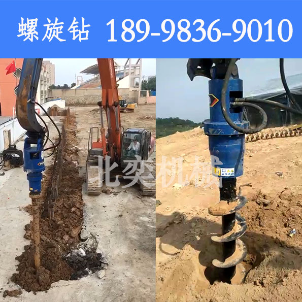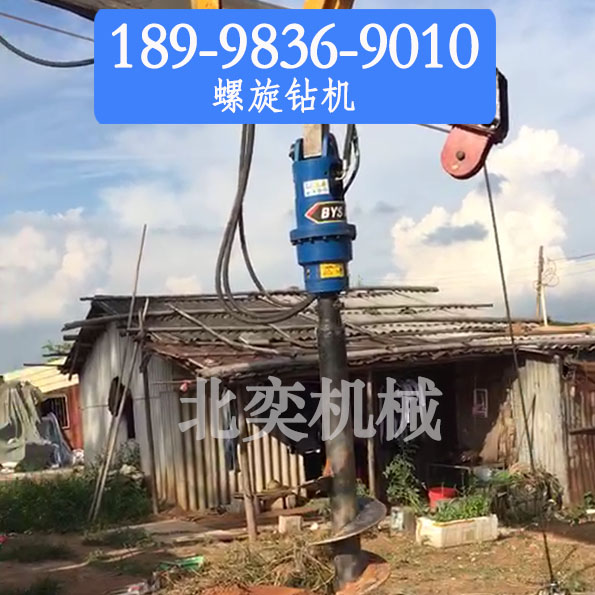 螺旋鉆機-安 裝于挖掘機上使用,用于挖坑、太陽能管樁引孔或打螺旋地樁,主要由驅動頭和鉆頭組件構成,驅動頭與鉆頭組件固定連接,鉆頭組件包括鉆桿、包繞著鉆桿的螺旋葉片、以及設置在鉆桿末端的鉆頭或者螺旋地樁,所述的螺旋葉片的底端設置有鉆齒。結構簡單、穿鑿能力更強、生產運用成本低、靈活性高。,用于電力電信挖坑、凍土挖坑、太陽能樁引孔、打螺旋地樁的。挖機螺旋鉆機(旋挖鉆機)的驅動頭是螺旋鉆機的關鍵部件,該部件由進口液壓馬達、行星齒輪減速機組成。同時通過生產各種規(guī)格的托架、鉆桿加長桿,使得挖機鉆機可以與多種規(guī)格的挖掘機、裝載機等進行配套使用并且使得鉆孔可以鉆的更深。鉆桿規(guī)格,直徑范圍覆蓋10mm-1500mm,大鉆孔深度可達到12米。