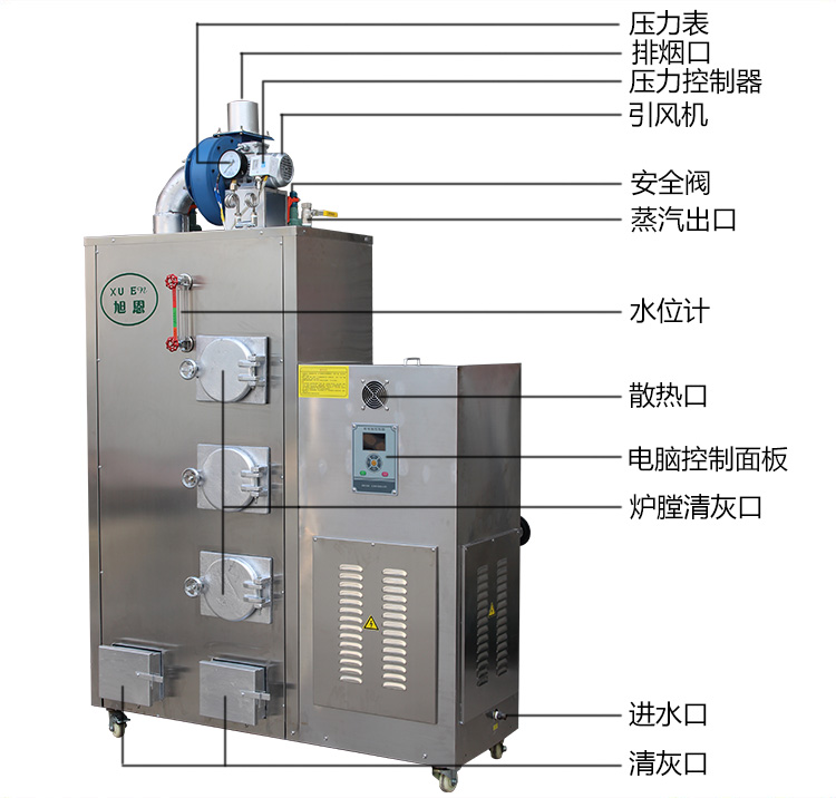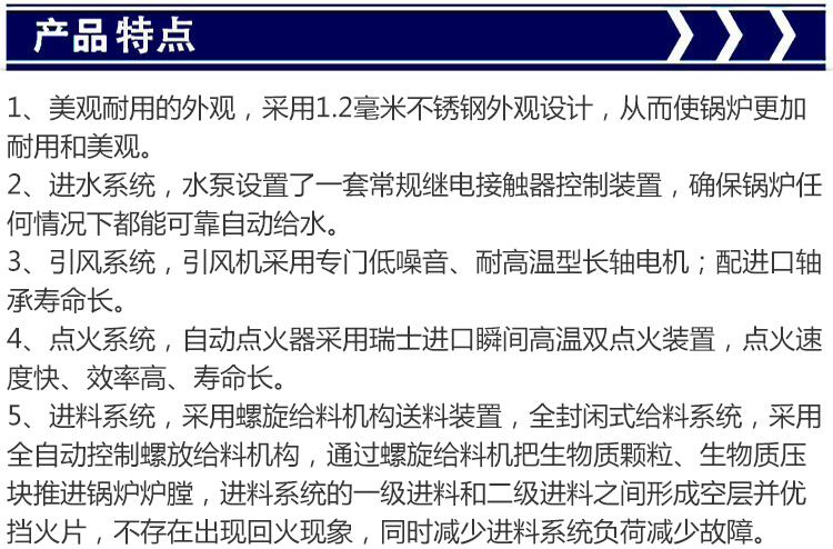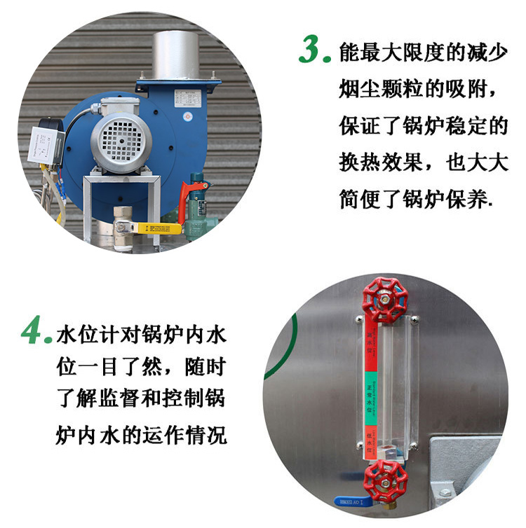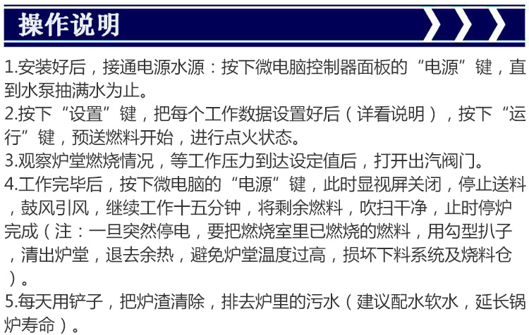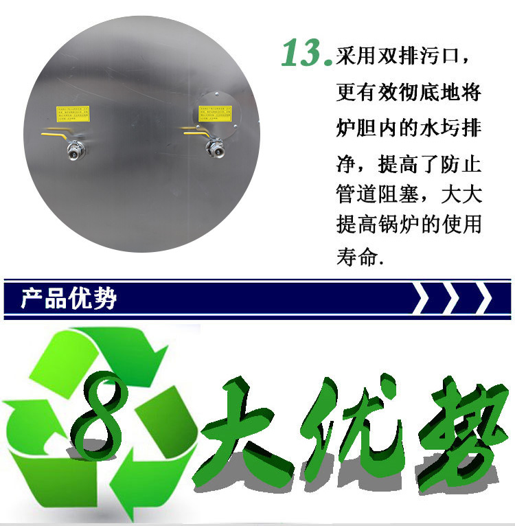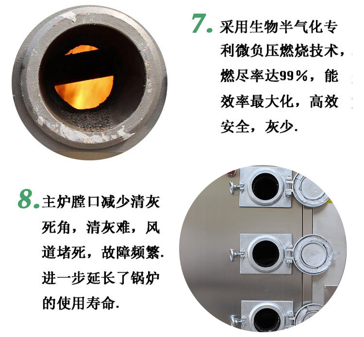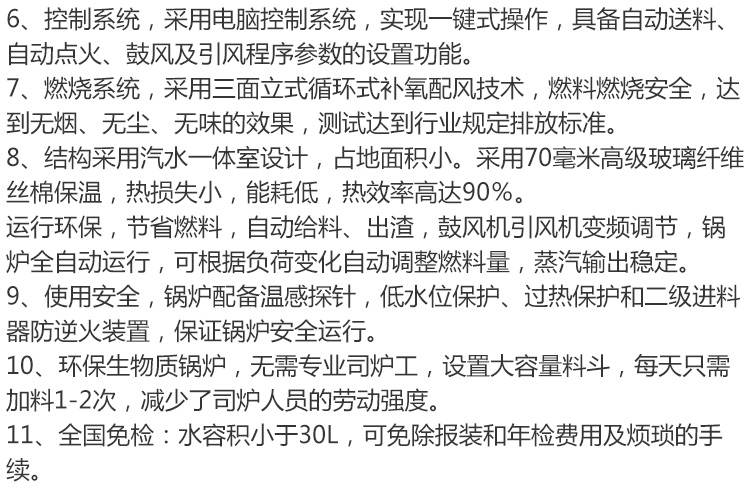 臥式蒸汽鍋爐為鍋殼式全濕背順流三回程煙火管結(jié)構(gòu),火焰在大燃燒室內(nèi)微正壓燃燒,完全伸展,燃燒熱負(fù)荷低,燃燒熱效率高,有效地降低了排煙溫度,節(jié)能降耗,使用經(jīng)濟(jì)。波形爐膽和螺紋煙管結(jié)構(gòu),即提高了鍋爐的吸熱強(qiáng)度,又滿足了換熱面受熱膨脹的需要,科學(xué)合理,經(jīng)久耐用。