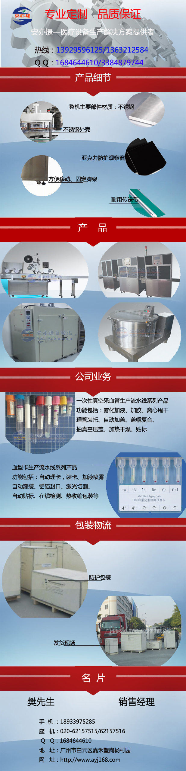 廣州市安亦捷自動(dòng)化設(shè)備有限公司是一家專注于醫(yī)療用品生產(chǎn)設(shè)備的設(shè)計(jì)和制造的高新技術(shù)企業(yè),位于廣東省廣州市。公司自2009年成立以來,一直以“提供安全快捷的自動(dòng)化生產(chǎn)設(shè)備”為首任,為國(guó)內(nèi)外眾多醫(yī)療用品生產(chǎn)廠家提供自動(dòng)化、智能化、高效率的生產(chǎn)設(shè)備。產(chǎn)品也從最初只有真空采血管生產(chǎn)設(shè)備,擴(kuò)展到涵蓋培養(yǎng)皿、血型卡、診斷試劑等多個(gè)醫(yī)療用品領(lǐng)域。