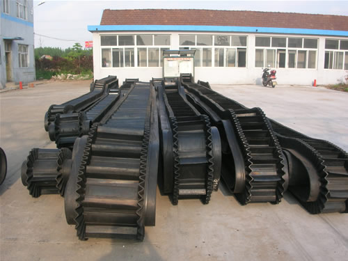 波狀擋邊輸送帶由基帶、擋邊、橫隔板3部分組成。擋邊起防止物料測滑撒落的作用。為便于繞過滾筒,檔邊設計成波紋狀;波狀擋邊輸送帶橫隔板的作用是承托物料,為了實現(xiàn)大傾角輸送,采用t型tc型。波狀擋邊輸送帶檔邊和橫隔板是用二次硫化的方法與基帶連接的,具有很高的連接強度