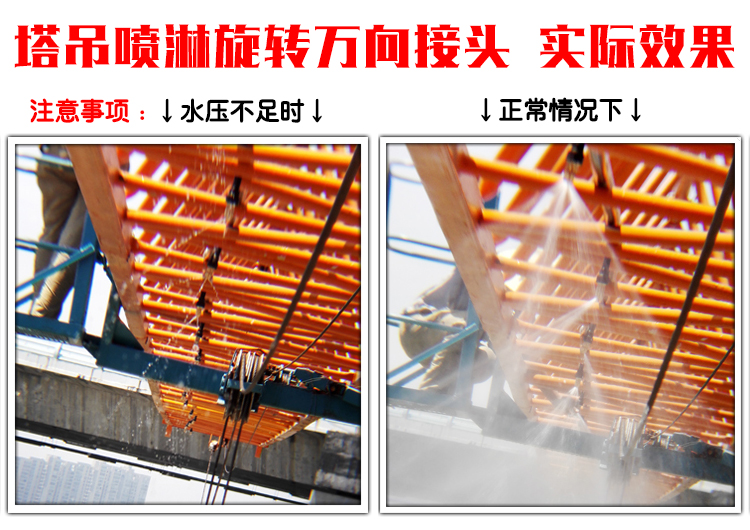 1、塔吊噴淋降塵系統(tǒng)包括:塔吊專用旋轉(zhuǎn)萬向節(jié)、支架,水管、過濾器、三通、活接、可調(diào)節(jié)噴頭等;應(yīng)采用ppr管,pe管或鍍鋅鋼管作為主線。