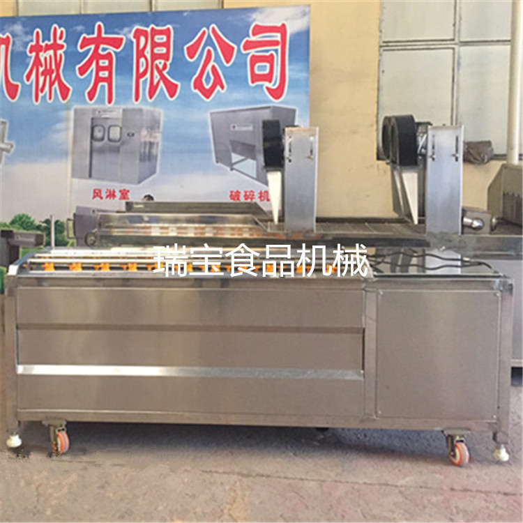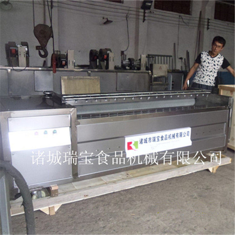 利用毛輥的轉(zhuǎn)動來去掉附著在蔬菜上的泥土(用毛輥絲較硬的毛輥可直接去皮),大型毛刷去皮機上部設有噴淋水管,毛刷清洗去皮機可對物料進行噴淋沖洗。每隔一定時間,打開清洗去皮機設備端部出料口,物料排除設備。