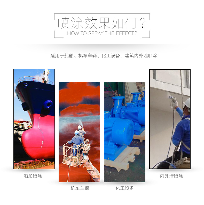 適用于船舶、機車車輛、化工設(shè)備、建筑內(nèi)外墻、鋼結(jié)構(gòu)等大面積噴涂作業(yè)。
