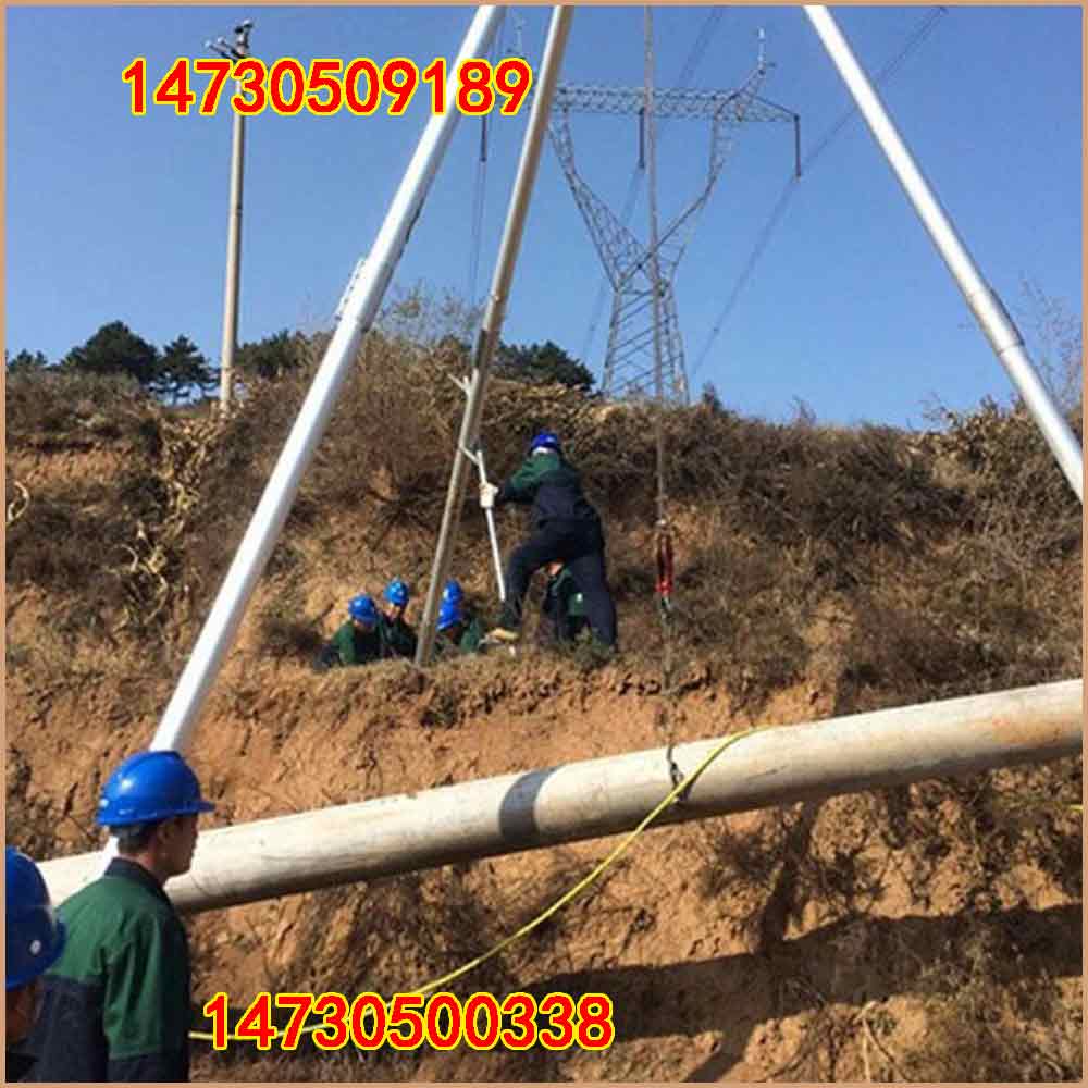 有一些施工地點因為地形的原因,無法使用三腳架立桿機施工,我廠還有人字立桿機可以適應(yīng)這種地勢。人字立桿機顧名思義就是兩根桿子的立桿機,立起來以后好像“人字”一樣,人字立桿機又叫人字拔桿,雙桿抱桿。這種立桿機分為兩種,其中一種是固定式的,固定式兩根桿子起立以后需要在桿子的頂部左右固定兩根風(fēng)繩。也就是說人字立桿機桿子垂直立起來以后,還需要在左右打兩根拉線,需要注意的是拉線必須得提前固定在地錨上邊。一定要結(jié)實。全部弄好以后也是通過固定在其中一根桿子上的手搖絞磨,把桿子頂部的起重滑車放下來。然后把油絲拴在水泥線稈的三分之二位置,緩緩的轉(zhuǎn)動手搖絞磨就可以完成立桿了。還有一種倒落式人字立桿機,倒落式立桿機相比較固定式的操作又不一樣了。
