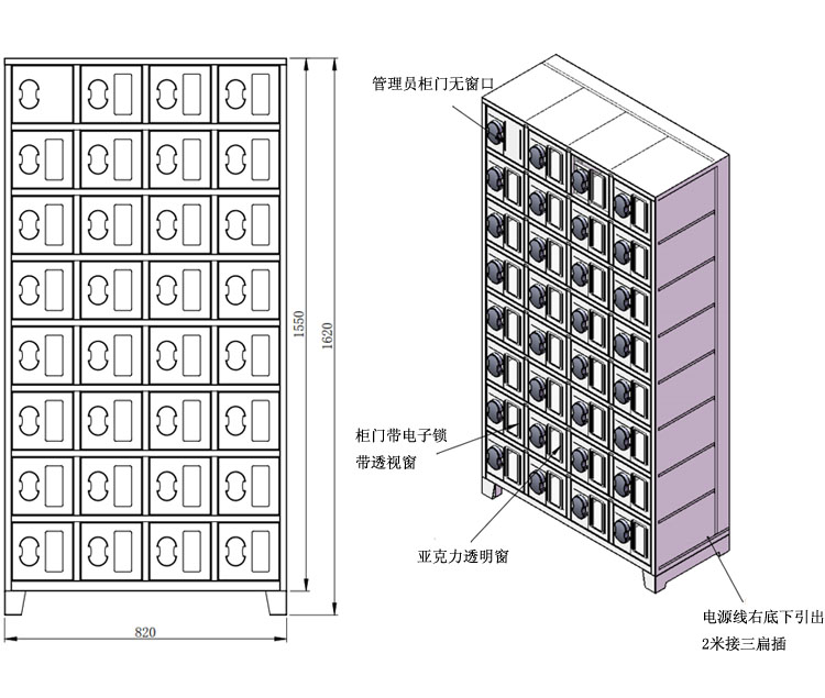 2、共32格獨立放置柜,柜門裝有電子感應(yīng)鎖,帶透視窗;