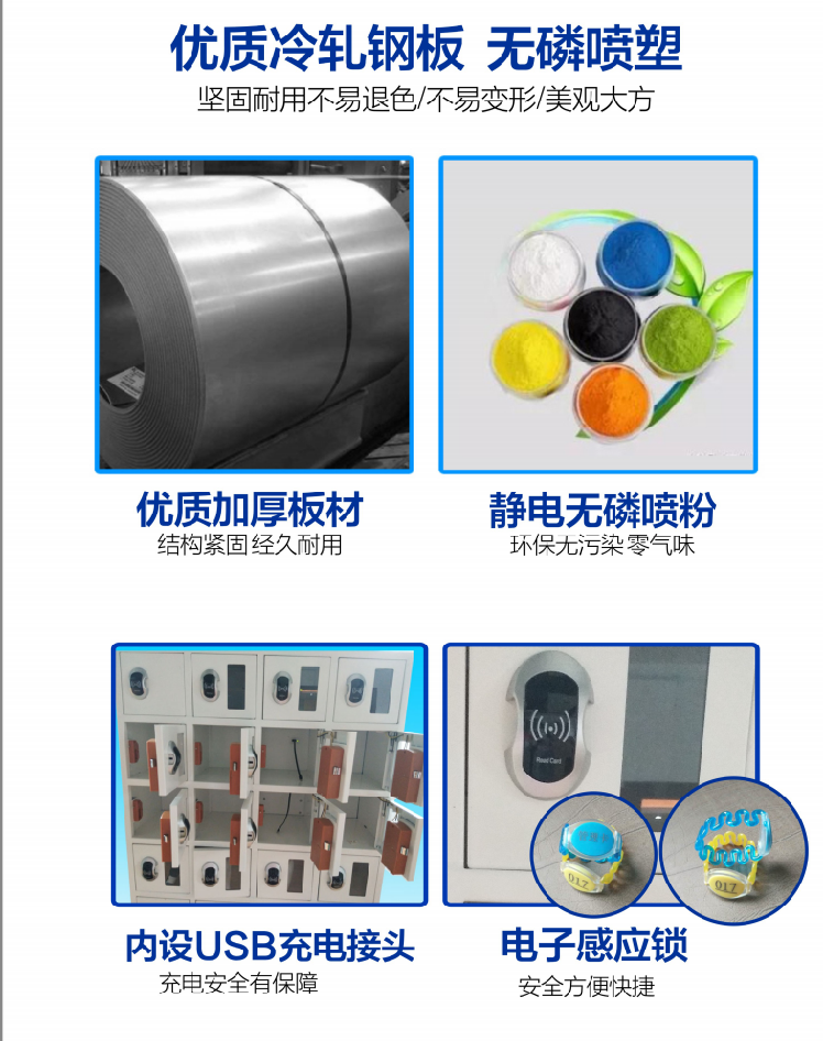 1、每個柜子單獨存放手機,柜內(nèi)有單獨的usb插口,輸出5v,可存放手機并同時充電;