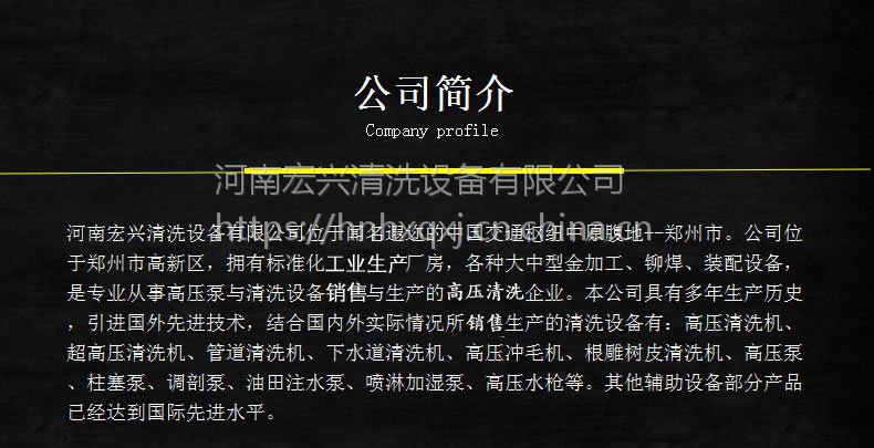 河南宏興清洗設(shè)備有限公司位于聞名遐邇的中國(guó)交通樞紐中原腹地—鄭州市。公司位于鄭州市高新區(qū),擁有標(biāo)準(zhǔn)化重型工業(yè)廠房,各種大中型金加工、鉚焊、裝配設(shè)備,是專(zhuān)業(yè)從事高壓泵與清洗設(shè)備研制與生產(chǎn)的高新技術(shù)企業(yè)。本公司具有多年生產(chǎn)歷史,引進(jìn)國(guó)外先進(jìn)技術(shù),結(jié)合國(guó)內(nèi)外實(shí)際情況所研制生產(chǎn)的清洗設(shè)備有:高壓清洗機(jī)、超高壓清洗機(jī)、管道清洗機(jī)、下水道清洗機(jī)、高壓沖毛機(jī)、根雕樹(shù)皮清洗機(jī)、高壓泵、柱塞泵、調(diào)剖泵、油田注水泵、...