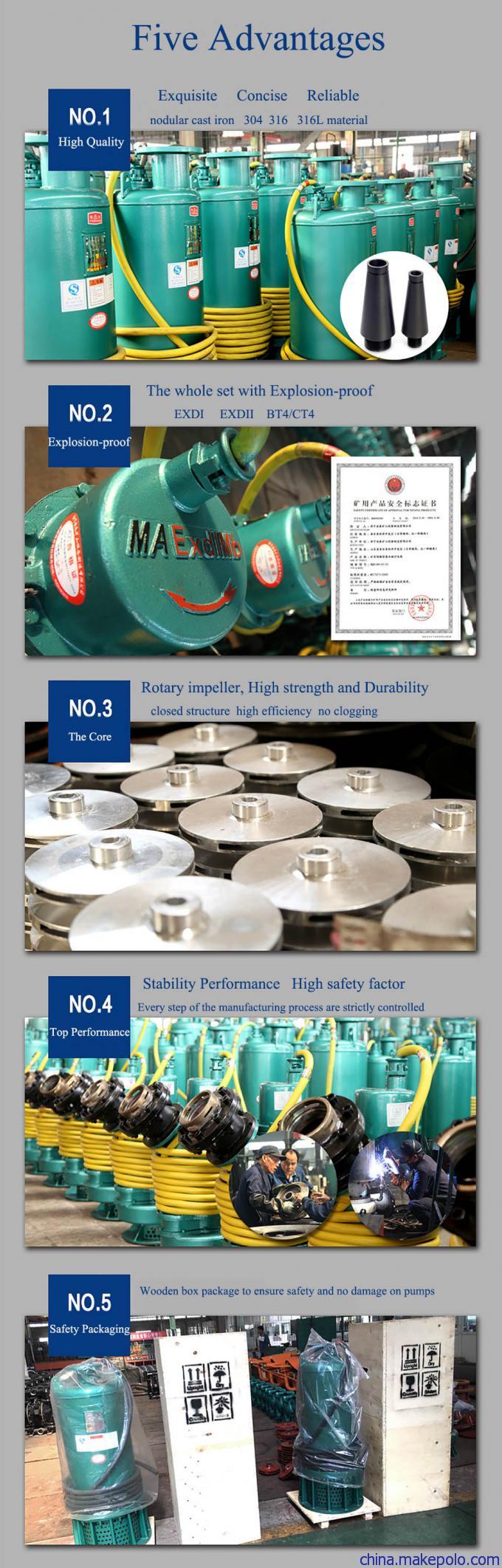 bqs礦用隔爆型排污排沙潛水電泵是我公司與江蘇大學(xué)聯(lián)合研制開發(fā)的,產(chǎn)品規(guī)格齊全,功率4kw,流量范圍15m3/h,揚程范圍從30m,產(chǎn)品皆實現(xiàn)了全揚程、無過載。安 立泰集團鍥而不舍地對產(chǎn)品進行技術(shù)創(chuàng)新,解決了排污排沙潛水電泵在產(chǎn)品結(jié)構(gòu)、參數(shù)優(yōu)化、制造工藝、運行效率、密封防漏、材料應(yīng)用等方面的技術(shù)關(guān)鍵問題,擁有二十多項專利技術(shù),應(yīng)用了多項最新研究成果,形成了成熟的電機、電泵制造工藝流程,與國內(nèi)同類產(chǎn)品相比具有安 全可靠、輕便實用、排污排沙性能好、使用壽命長、型譜合理、選型方便等優(yōu)點。