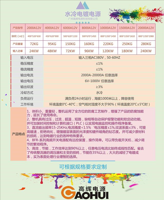 3、直流輸出頻率15-25khz,電流精度<1.0%‘電壓精度≤1%,紋波系數(shù)≤3%,可提高鍍速,拒絕鈍化,增強(qiáng)鍍層表面的光澤度和鍍件暗角的鉆芯度。并可減少原材料的損耗,達(dá)到電鍍行業(yè)的各種特殊要求。