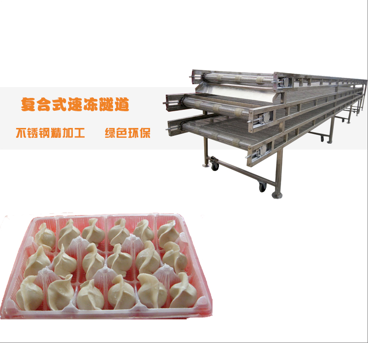 復(fù)合型往復(fù)式速凍隧道是在平板隧道的基礎(chǔ)上,根據(jù)國(guó)內(nèi)小型生產(chǎn)廠家或老廠址改造,廠地受到限制等廠家的要求設(shè)計(jì),研發(fā)制作,工藝精細(xì),結(jié)構(gòu)合理,性價(jià)比高,對(duì)速凍庫(kù)的大小要求不高,一般有8000*1300*1800mm以上就可以達(dá)到生產(chǎn)要求,產(chǎn)量在500kg/小時(shí)左右,設(shè)備基本型為三層網(wǎng)帶,由餃子輸送機(jī)、爬坡提升機(jī)、分散擺頭(左右式和伸縮式)速凍隧道,成品料倉(cāng)組成,通過(guò)網(wǎng)帶的三層翻轉(zhuǎn),延長(zhǎng)食品在冷庫(kù)里的時(shí)間,從而彌補(bǔ)冷庫(kù)不足的缺陷。結(jié)構(gòu)緊湊,占地小,***少,解決企業(yè)廠房面積小的困擾。