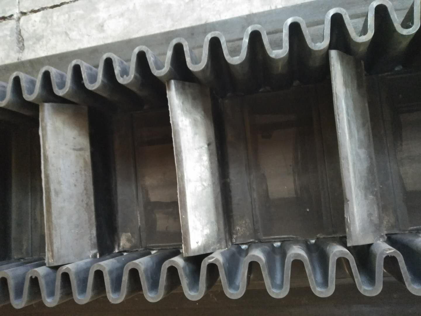 常見的擋邊輸送帶為大傾角波狀擋邊輸送帶,大傾角波狀擋邊輸送帶由基帶、擋邊、橫隔板3部分組成。擋邊起防止物料測(cè)滑撒落的作用。為便于繞過滾筒,檔邊設(shè)計(jì)成波紋狀;橫隔板的作用是承托物料,為了實(shí)現(xiàn)大傾角輸送,采用t型tc型。檔邊和橫隔板是用二次硫化的方法與基帶連接的,具有很高的連接強(qiáng)度。