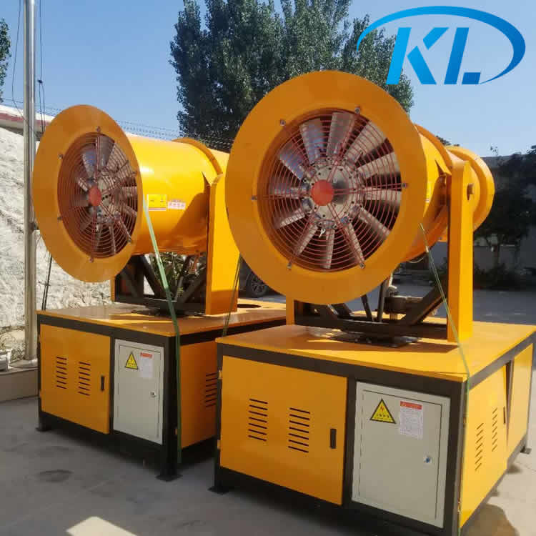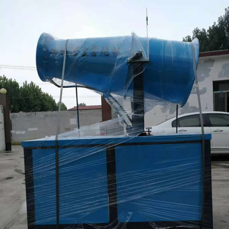 霧炮機(jī)是使用增壓泵、精細(xì)噴嘴將水霧化后,再借助風(fēng)筒風(fēng)力將霧化后的水霧送到50米、60米、80米開外的地方,在水霧與空氣中粉 塵相遇時凝結(jié)然后降落。