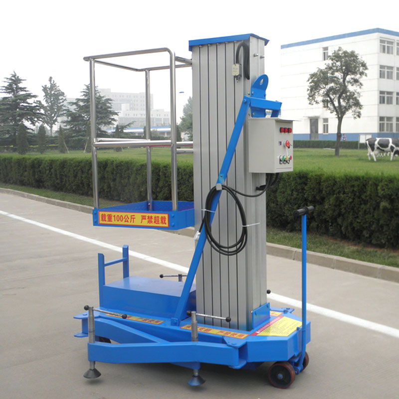 1. 單桅柱鋁合金升降平臺: 由單桅柱支撐作業(yè)平臺,是最早出現(xiàn)的鋁合金升降機(jī)。整機(jī)重量輕,移動靈活,適用于單人操作,縮合后能進(jìn)入一般標(biāo)準(zhǔn)門道和大樓的電梯。