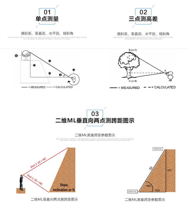 6、操作簡單,可進行單點測距測角、單點測垂直相對高度、兩點測跨距、三點測高等功能操作。