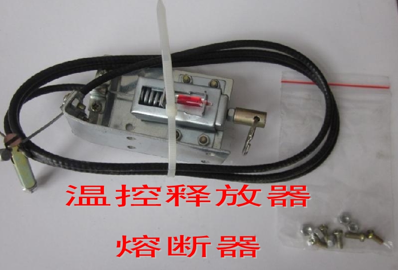 卷簾門溫控熔斷釋放裝置,適用于垂直地面卷放的防火卷簾門,在其箱體內(nèi)裝有可移動的滑塊,一拉簧分別與滑塊及箱體連接,一拉繩分別與滑塊及卷簾門開閉機之離合器連接,二銷軸分別穿過滑塊和箱體,銷軸兩端裝有易熔合金焊接的金屬片,當(dāng)環(huán)境溫度超過某定值。易熔合金熔化, 金屬片分離, 在彈簧,力作用下拉繩牽動離合器脫離,卷簾門自動釋放下降。