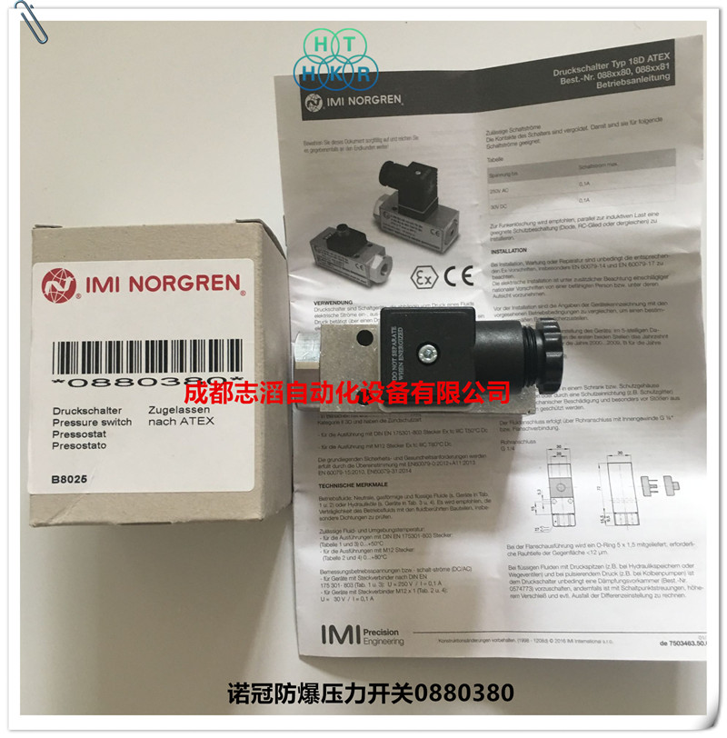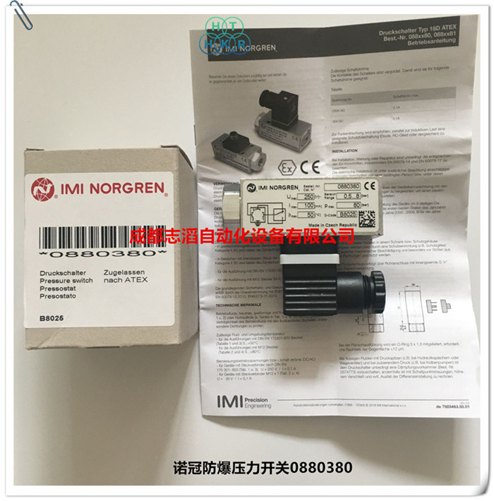 0880380英國(guó)諾冠iminorgren防爆壓力開(kāi)關(guān)技術(shù)參數(shù):工作壓力范圍0.5-8bar、切換壓差0.25-0.65bar、承受壓力80bar、切換時(shí)間100、壓力開(kāi)關(guān)材料鋁、密封件fkm/ms、接口尺寸g1/4、重量0.2kg!