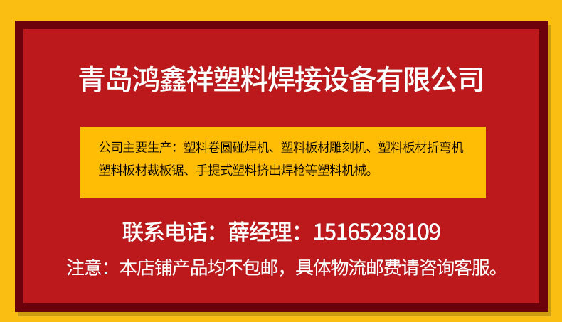 青島鴻鑫祥塑料焊接設(shè)備有限公司所從事折彎機(jī)、大型雕刻機(jī)、PP板PE板塑料焊條生產(chǎn)線、擠出式塑料焊機(jī)(手提式塑料焊機(jī))的設(shè)計和生產(chǎn)的專業(yè)廠家,產(chǎn)品廣泛應(yīng)用于塑料焊接、塑料化工防腐、塑料容器焊接、塑料管材及塑料管件焊接制作及電鍍設(shè)備制作等各行各業(yè)。今年又開發(fā)生產(chǎn)了自動塑料板材折彎機(jī)、塑料碰焊機(jī)、塑料下料機(jī)等等。為電鍍設(shè)備行業(yè)、環(huán)保設(shè)備行業(yè),彌補(bǔ)了塑料產(chǎn)業(yè)加工,提供了質(zhì)美價廉的設(shè)備,彌補(bǔ)了塑料行業(yè)的不足...