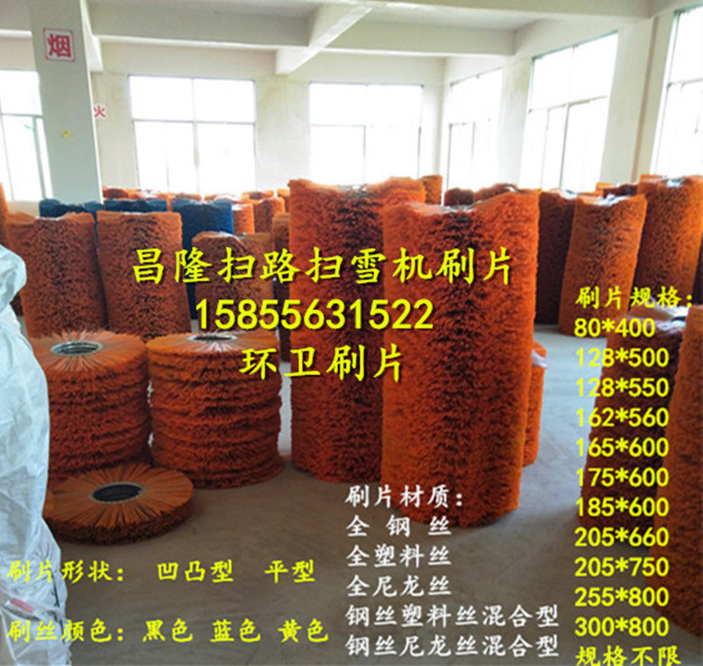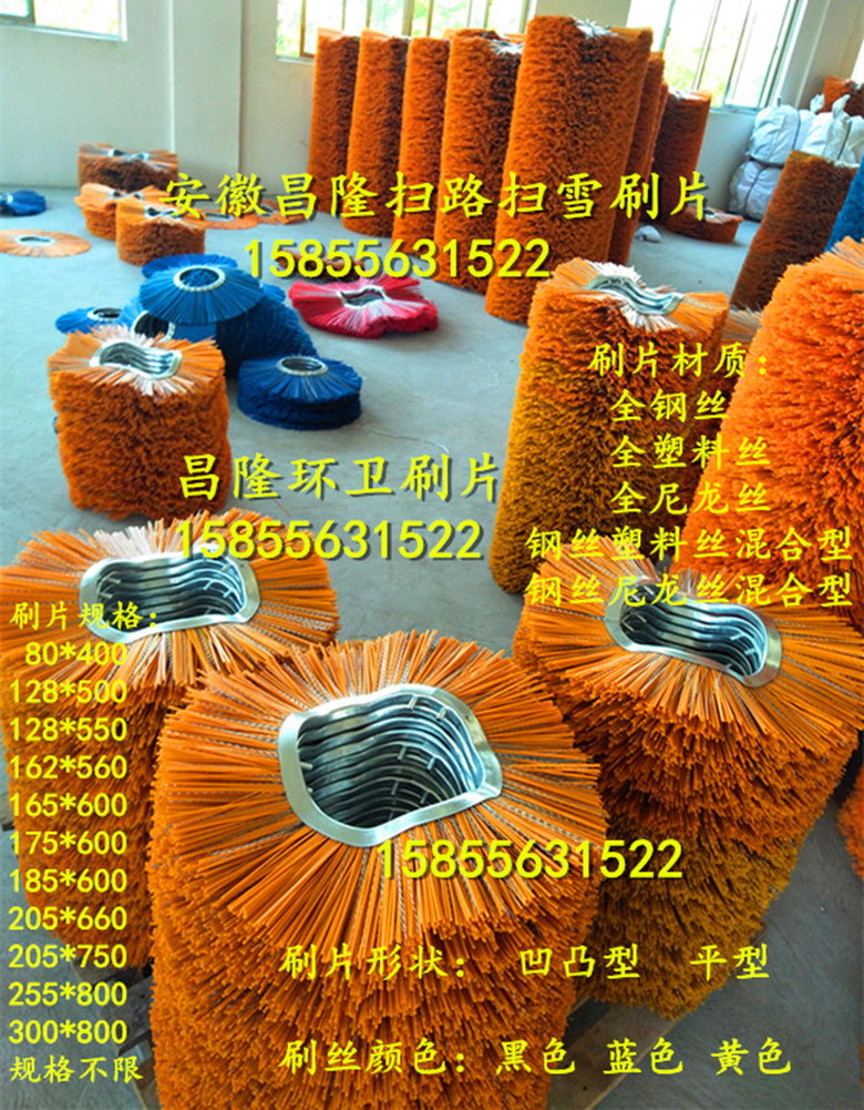 掃路刷掃雪刷護(hù)欄刷環(huán)衛(wèi)刷生產(chǎn)廠家-安 徽精泰環(huán)衛(wèi)刷有限公司生產(chǎn)的掃路車掃雪車毛刷片,是生產(chǎn)各類掃路掃雪刷片及刷輥的毛刷廠家!掃雪刷輥價格實惠!掃雪刷輥質(zhì)量!產(chǎn)品適用于德國施密特、威海廣泰、武漢九通、沈陽德通、美國mb掃雪車、山東匯強(qiáng)等廠家生產(chǎn)掃雪車的掃雪滾刷更換,可為各大掃雪車廠家的配套,產(chǎn)品銷往北京、哈爾濱、沈陽、長春、新疆等地,也為空軍各大機(jī)場服務(wù)。精泰掃路掃雪刷片采用進(jìn)口尼龍刷絲、鍍鋅鋼絲和pp絲等材質(zhì),強(qiáng)度高、抗磨損、耐腐蝕、特別是能在超低溫氣候下工作。主要用于國內(nèi)外各種掃雪車,裝載車,滾刷片常用規(guī)格有:內(nèi)徑128,外徑500,內(nèi)徑162,外徑550,內(nèi)徑165,外徑600,內(nèi)徑205,外徑660,內(nèi)徑208,外徑670,內(nèi)徑255,外徑800,內(nèi)徑300,外徑900,內(nèi)徑500,外徑1500等規(guī)格,可按客戶要求,刷絲有pp絲和pp絲和鋼絲混合。掃雪刷片采用pp絲+彈簧鋼絲組合材質(zhì)設(shè)計的滾刷,不掉毛、不斷毛、耐磨、不損傷路面且掃雪效果好,精泰掃雪刷片能在超低溫氣候條件下長時間掃雪不折斷,彈性好。精泰掃路刷片掃雪刷片質(zhì)量已得到廣大客戶的認(rèn)可了,具有耐磨抗高溫等特點(diǎn),產(chǎn)品質(zhì)量實行三包,價格從優(yōu),歡迎新老來人來電洽談訂購!