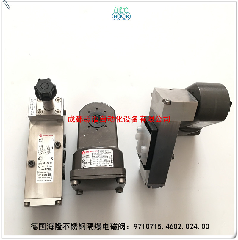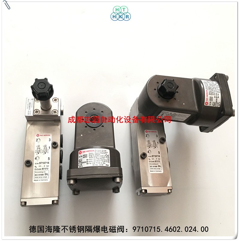 9710715.4602.024.00德國海隆(imi herion)不銹鋼防爆電磁閥參數(shù)簡介:閥體材料不銹鋼、接口尺寸1、3、5為1/4npt,2和4為法蘭;功能為2位5通;工作方式電控/彈簧;kv值為1.3立方米/h;閥體重量1kg;配海隆線圈4602(功耗為0.8w、額定電流為33ma、ex-防護類別為ii2g,ii2d、防護等級為ex d mb iict5/t6 ip66 t130°、環(huán)境及流體溫度范圍-40到80攝氏度t5,-40到70攝氏度t6,-40到80攝氏度、電氣接口為m20x1.5、線圈重量為0.85kg、產(chǎn)地為捷克)