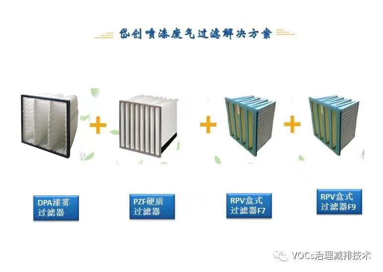 岱創(chuàng)建議,噴漆房廢氣先經過四道過濾器來過濾固體顆粒,即dpa漆霧過濾器—f5袋式過濾器—f7中效袋式過濾器-f9袋式過濾。最后通過活性炭進行吸附有_機_溶_劑 _。廢氣經過以上的過濾,基本能夠達到排放要求。dpa漆霧過濾器,可以將10微米以上的漆霧過濾去除。空氣經過兩道中效袋式過濾器和一道亞高效過濾器,基本可以將1微米以上其它類型固體顆粒去除,噴涂廢氣經過上述四層過濾,廢氣中不再有_固體廢物,只含有_有_機_溶_劑 _。最后,含有_有_機_溶_劑 _的廢氣通過voc廢氣處理設備處理后,涂裝產生廢氣將被變成干凈的氣體可直接排放。