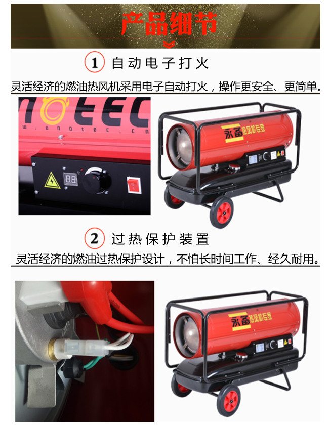 2、柴油暖風機升溫迅速,加熱均勻、只要開啟機器,幾分鐘之后你就好感受到室溫有所提升,加熱速度快。