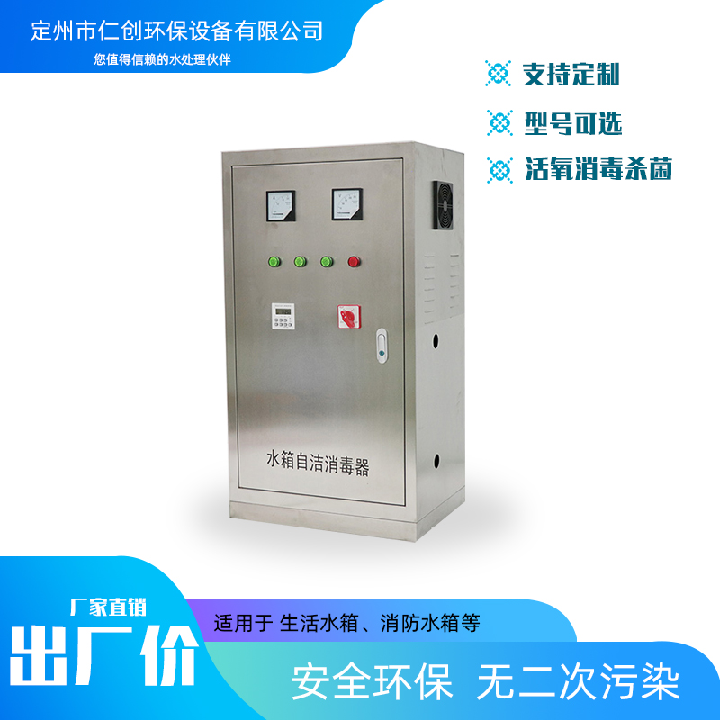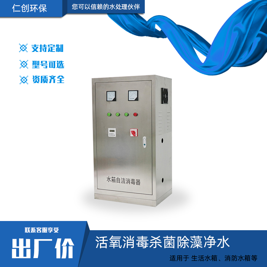 水箱自潔消毒器的循環(huán)水缸置于水箱的中下部,以保證水箱的水循環(huán)均勻。當(dāng)水位達(dá)到液位計(jì)設(shè)定的高水位時,電控柜開始啟動高壓電源和潛水泵所產(chǎn)生的強(qiáng)氧化氣體經(jīng)管路,至曝氣部分;對水進(jìn)行曝氣消毒,同時,潛水泵將經(jīng)過消毒的水送回水箱,使停滯的水循環(huán)起來,如此循環(huán)下去,對水徹底的消毒,保證了水的質(zhì)量。本產(chǎn)品出廠前,已將時間設(shè)定好,用戶無需再設(shè)定。