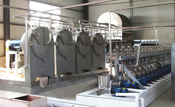 除砂后的薯類乳液進(jìn)入提取單元,提取單元由3臺(tái)離心篩組成,包括纖維泵和淀粉 乳液泵。經(jīng)過(guò)3級(jí)篩分的纖維(薯渣)被來(lái)自主管道的工藝水和多級(jí)旋流站的細(xì)胞液以逆流方式清洗出去。