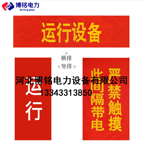2、磁吸工紅布幔:一般用于戶內(nèi),常規(guī)印制黃色字跡文字:“運(yùn)行”、“運(yùn)行中”、“正在運(yùn)行”、“運(yùn)行設(shè)備”、“設(shè)備正在運(yùn)行”“配電盤用”;白色字跡文字:“調(diào)試”、“調(diào)試設(shè)備”、“正在調(diào)試”等