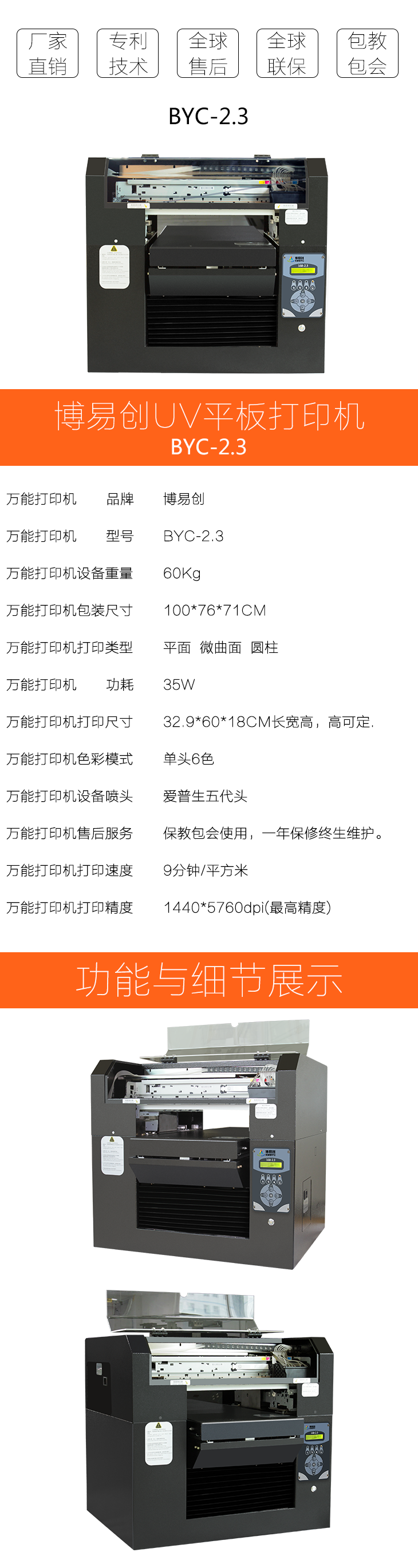 博易創(chuàng)公司有不同款式的機(jī)型,客戶可以根據(jù)自己的需要選擇合適的機(jī)型,如果是茅臺(tái)瓶子的那種白瓶,可以選擇萬能的機(jī)器,如果瓶子是深色的,直接打印顏色不顯色,需要先打印白墨再打印彩墨,這樣的話,顏色才會(huì)顯,需要用uv機(jī)來打印了。今天和大家著重介紹萬能的機(jī)器,a3經(jīng)濟(jì)型的,型號(hào):byc168-2.3款,此款機(jī)器的相關(guān)參數(shù)如下: