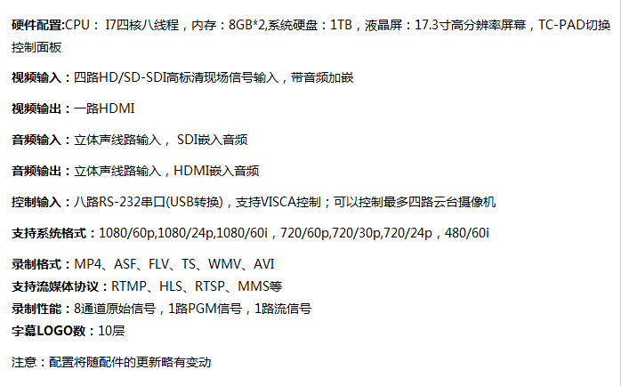集成度高:集合了傳統(tǒng)切換臺(tái)、調(diào)音臺(tái)、錄像機(jī)、編碼器等多種設(shè)備的功能于一體;單臺(tái)設(shè)備即可完成導(dǎo)播切換、字幕、角標(biāo)、錄制、直播、虛擬摳像等功能,并集成了顯示器、鼠標(biāo)鍵盤(pán)、導(dǎo)播鍵盤(pán)、調(diào)音臺(tái)于一體方便使用。