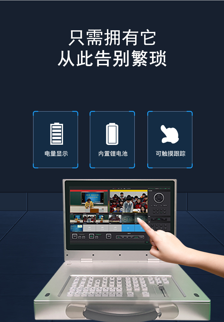 面板上設(shè)計電池余量顯示燈,確保系統(tǒng)再無外接電源環(huán)境下巡航8小時以上。支持網(wǎng)絡(luò)流媒體實時直播,顯示系統(tǒng)空間及錄制時長,具備存儲空間預(yù)警功能,支持本地導(dǎo)播與遠程導(dǎo)播兩種導(dǎo)播方式;支持flv或mp4格式錄制、支持電影模式、資源模式錄制,支持雙分屏、三分屏、畫中畫等四種以上場景模式錄制,支持字幕、課程信息、臺標、片頭片尾添加;主機配備56鍵位導(dǎo)播快捷切換面板,可以對攝像機就行云臺控制操作,也支持攝像機預(yù)置位設(shè)置,同時支持各類導(dǎo)播切換。