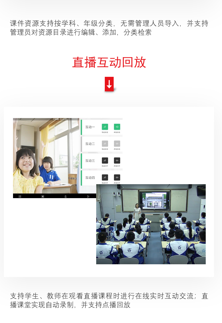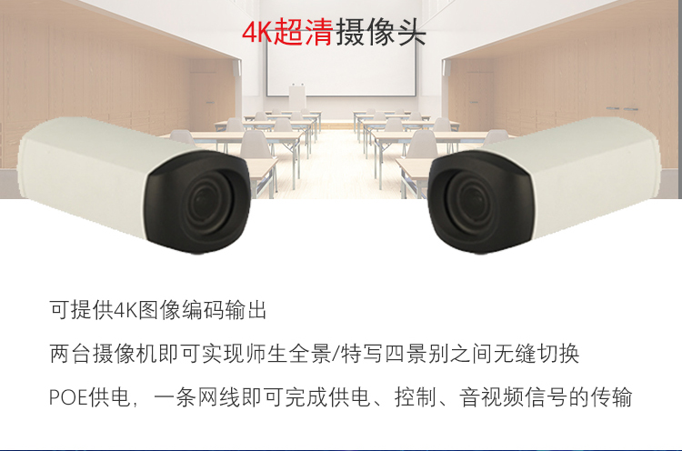 4.錄播主機(jī)支持2機(jī)位4景別,2路4k電子云臺攝像機(jī)接入,顯示“教師特寫”、“教師全景”、“學(xué)生特寫”和“學(xué)生全景”4個(gè)景別的錄制;