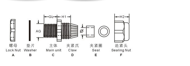 夾緊爪與密封件特殊之設(shè)計(jì),配合迫緊頭裝配省時(shí)便利,夾緊電纜范圍大,抗拉力特強(qiáng),可防水、防塵、防鹽 、耐酸 堿 、 酒精、油、脂及一般溶劑