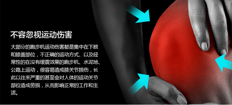 不容忽視的運(yùn)動傷害:大部分的跑步機(jī)運(yùn)動傷害都是集中在下肢和膝蓋部位,不正確的運(yùn)動方式、以及經(jīng)常性的在沒有緩震效果的跑步機(jī)、水泥地、公路上運(yùn)動,很容易造成膝關(guān)節(jié)損傷,上此以往嚴(yán)重的甚至?xí)䦟θ梭w的運(yùn)動關(guān)節(jié)部位造成勞損,從而影響正常的工作和生活。
