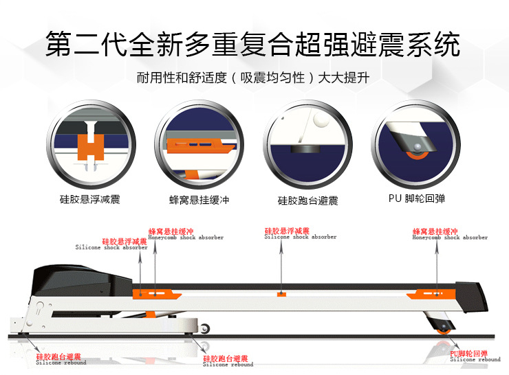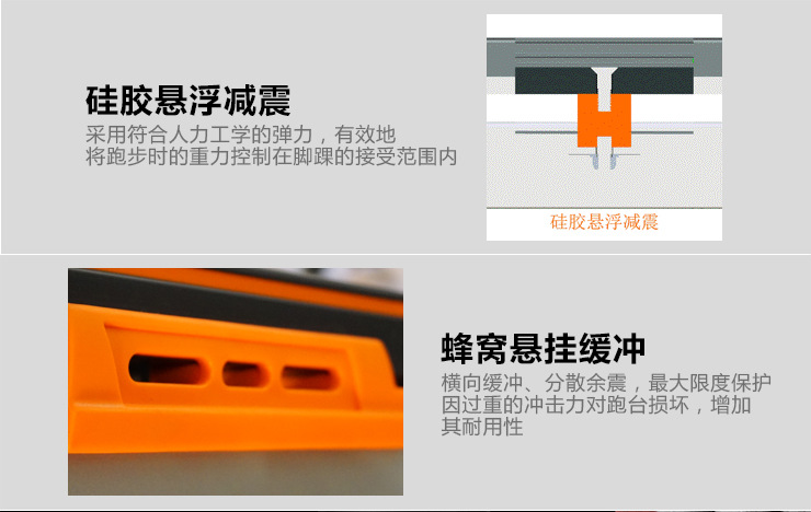 蜂窩懸掛緩沖:橫向緩沖、分散余震、最大限度保護(hù)因過重的沖擊力對跑臺損壞,增加其耐用性。