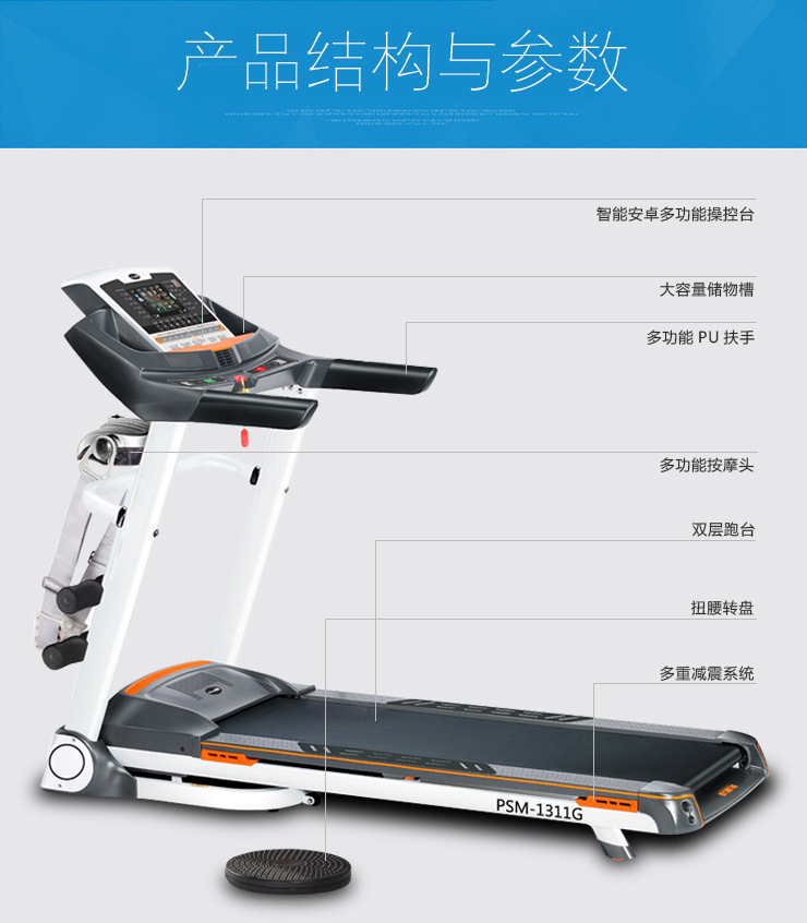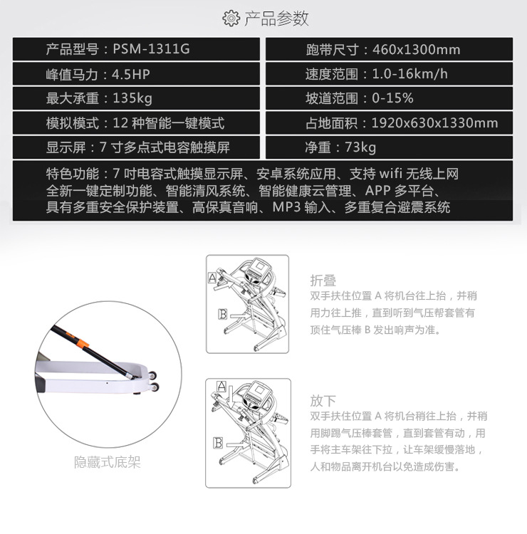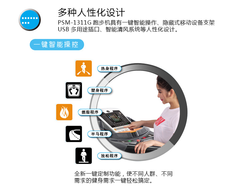 psm-1311g跑步機(jī)具備一鍵智能操作、隱藏式移動設(shè)備支架、usb多用途插口、只能清風(fēng)系統(tǒng)等人性化設(shè)計(jì)。