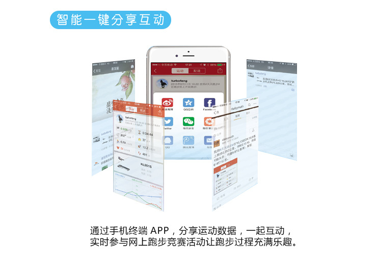 智能一鍵分享互動:通過收集終端app,分享運(yùn)動數(shù)據(jù),一起互動,實(shí)時(shí)參與網(wǎng)上跑步競賽活動讓跑步過程充滿樂趣。