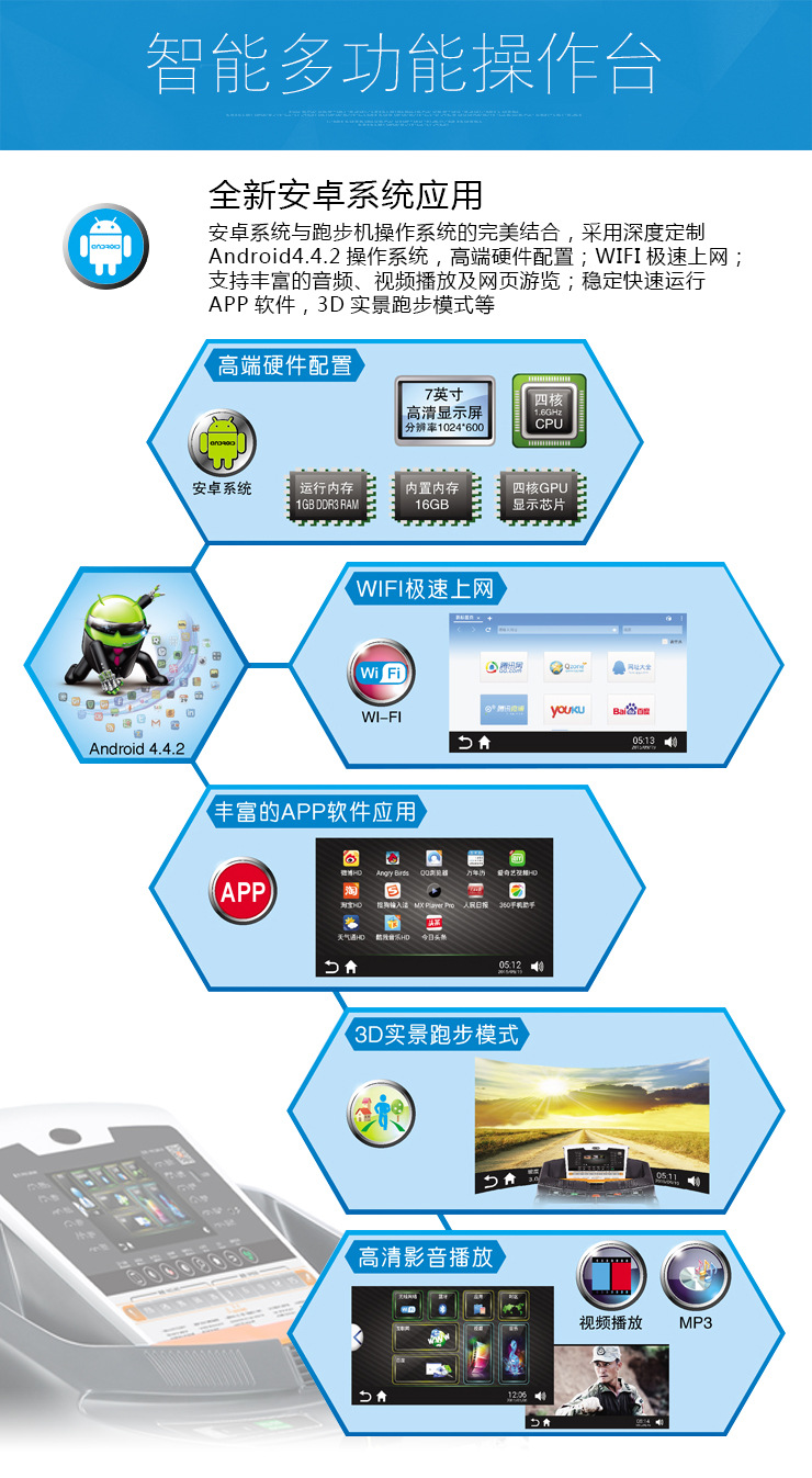 全新安 卓系統(tǒng)應(yīng)用:安 卓系統(tǒng)與跑步機(jī)操作系統(tǒng)的完美結(jié)合,采用深度定制android4.4.2操作系統(tǒng),高端硬件配置;wifi極速上網(wǎng);支持豐富得音頻、視頻播放及網(wǎng)頁瀏覽;穩(wěn)定快速運(yùn)行app軟件,3d實(shí)景跑步模式等。